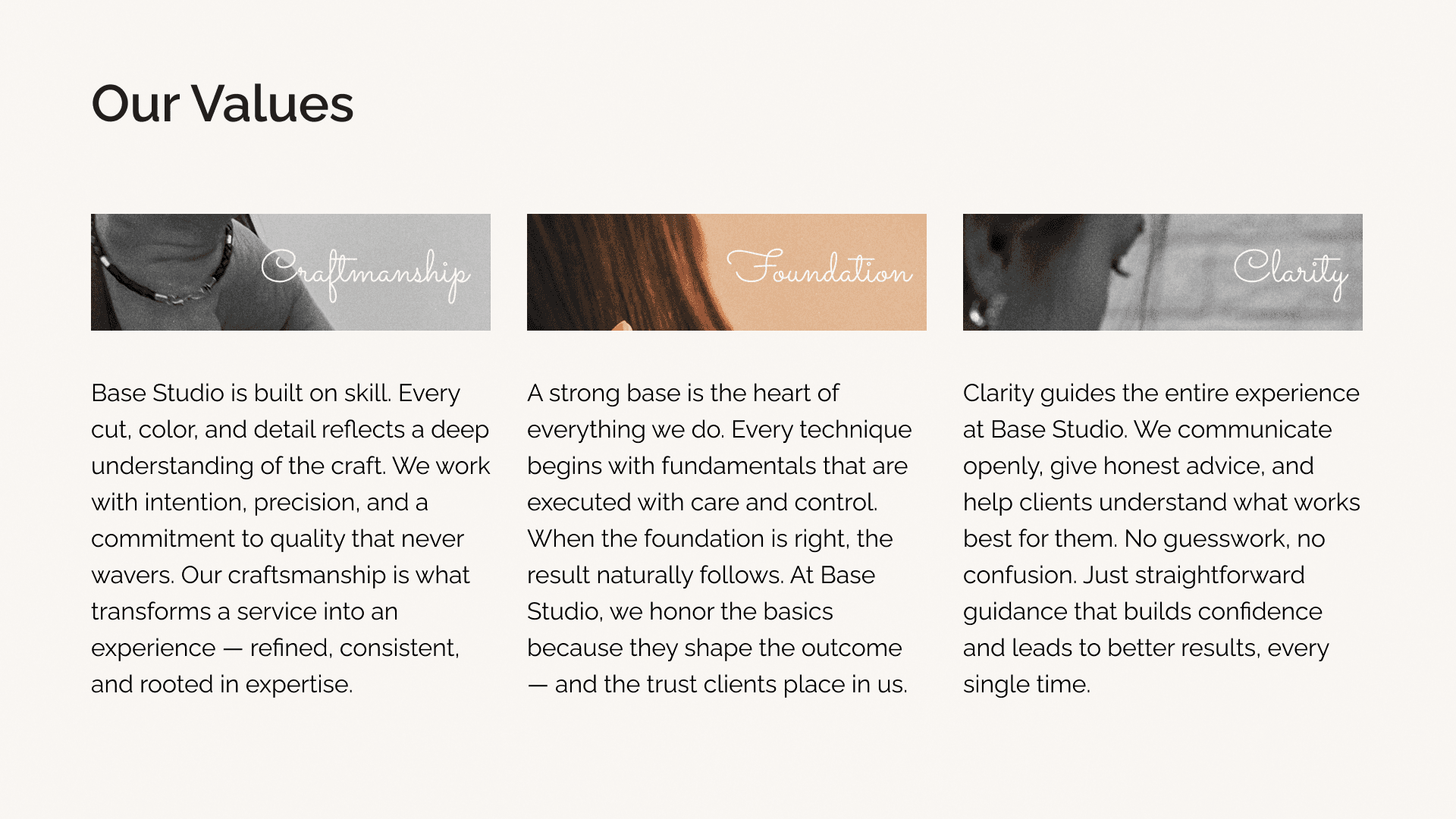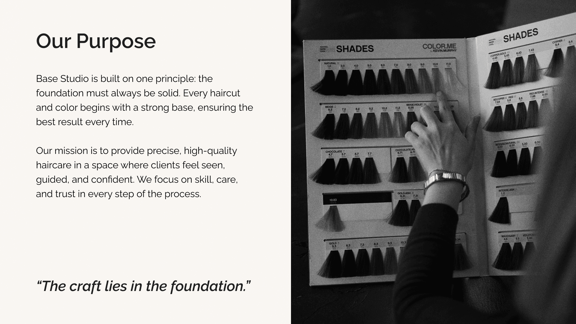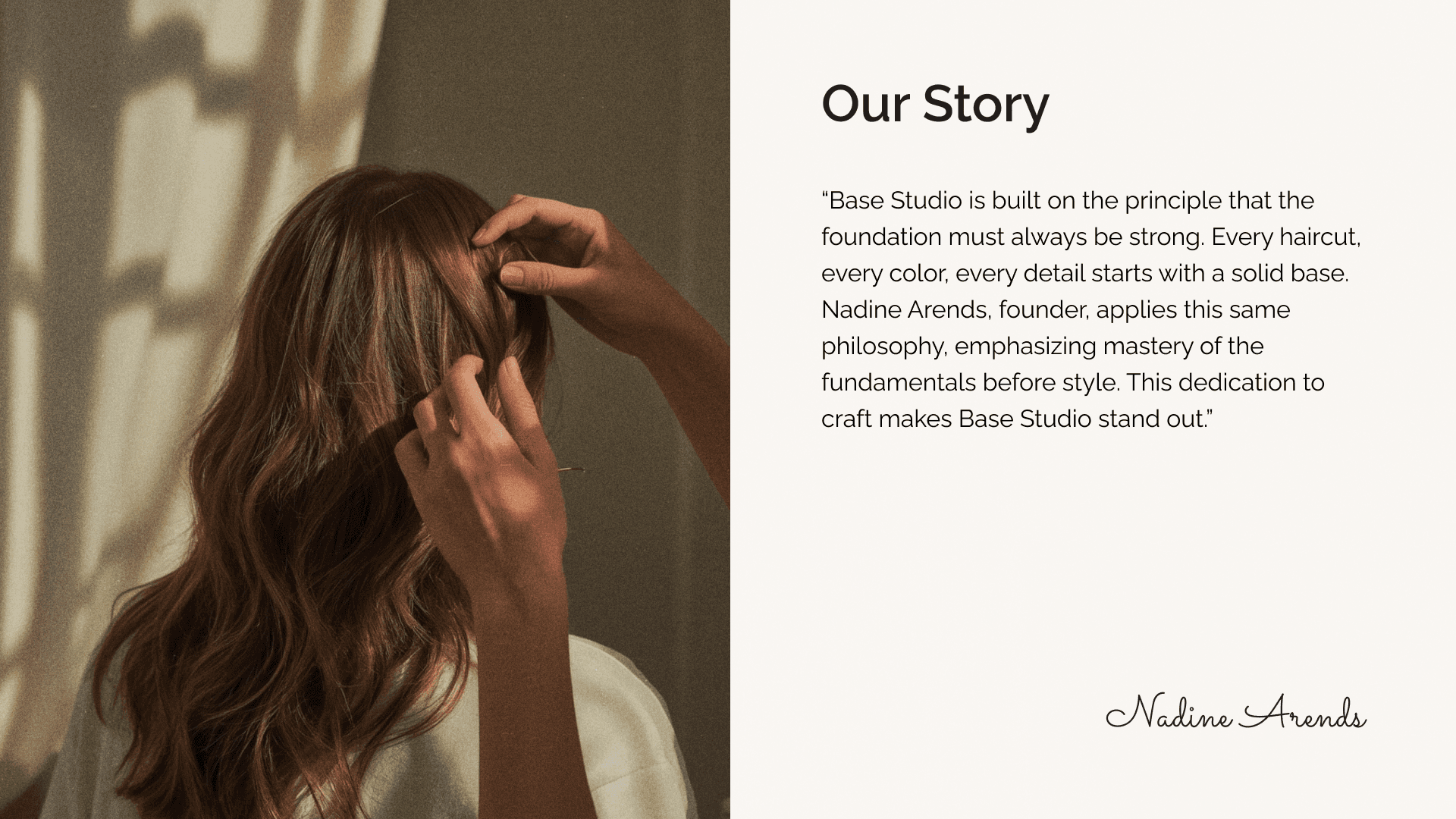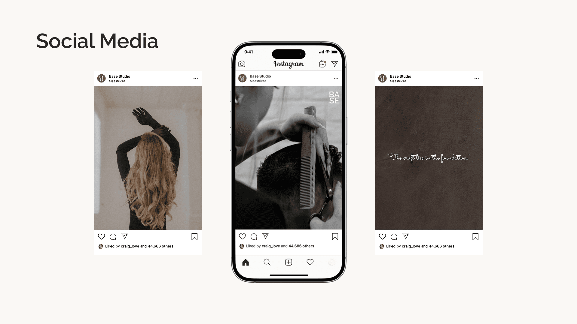Base Studio heeft nu een rustig, strak en professioneel merk dat exact weerspiegelt hoe zij werkt. Het salon beschikt oer een sterke naam, een herkenbare visuele identiteit, een consistente online aanwezigheid en materialen die direct vertrouwen wekken bij haar doelgroep. Het merk staat volledig klaar om te groeien, op een fundament dat klopt.